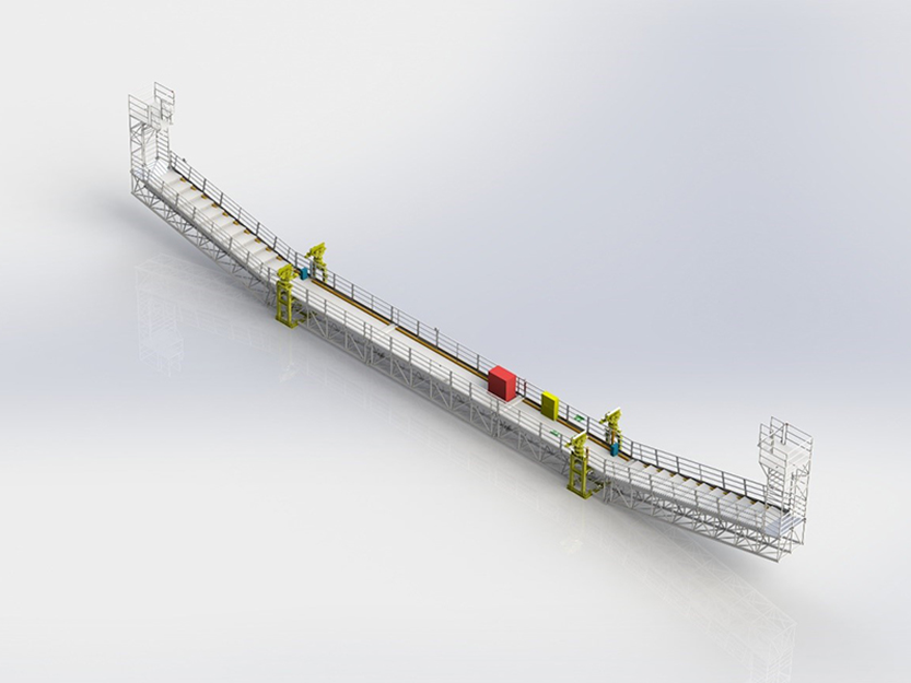 檢查車可對鋼箱梁外側(cè)進(jìn)行全方位、全立體的檢測和維護(hù)。直線行走可以檢測大部分區(qū)域;利用橫向軌道變軌可對主墩外側(cè)直線行走時的...
